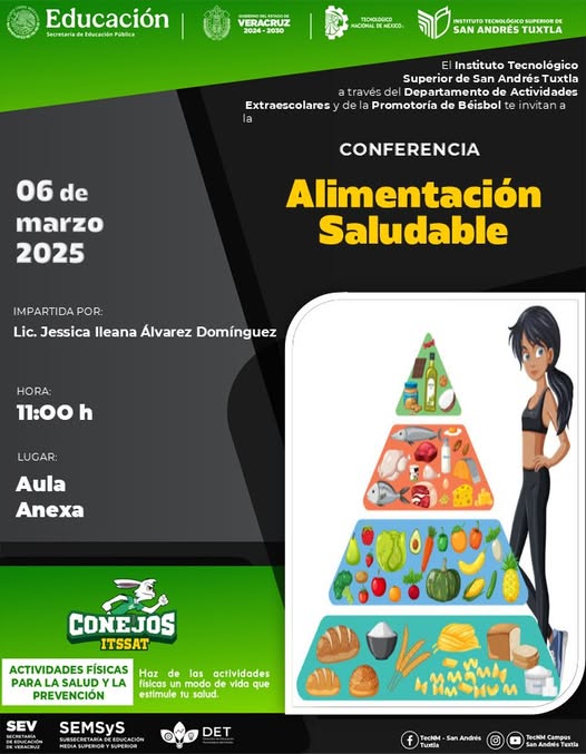El Departamento de Actividades Extraescolares y la Promotoría de Béisbol del ITSSAT, te invitan a la 𝐂𝐨𝐧𝐟𝐞𝐫𝐞𝐧𝐜𝐢𝐚 «𝐀𝐥𝐢𝐦𝐞𝐧𝐭𝐚𝐜𝐢𝐨́𝐧 𝐒𝐚𝐥𝐮𝐝𝐚𝐛𝐥𝐞».