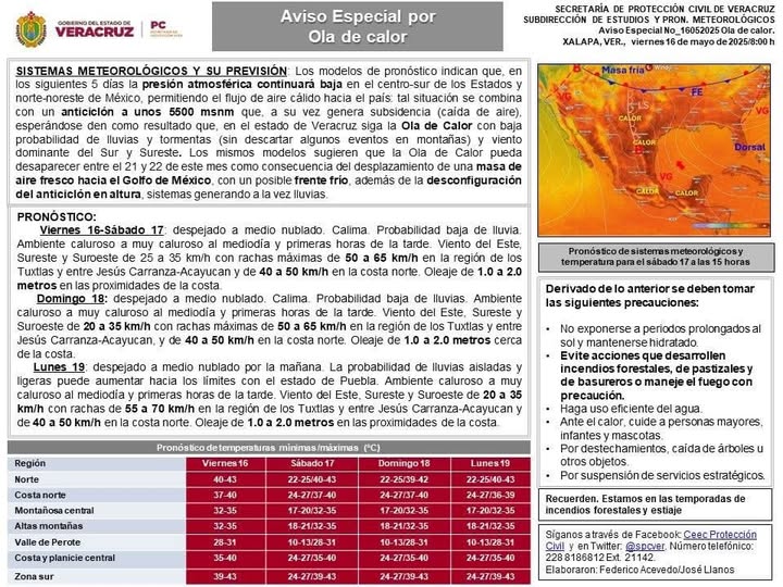 Viernes 16-Sábado 17: despejado a medio nublado. Calima. Probabilidad baja de lluvia. Ambiente caluroso a muy caluroso al mediodía y primeras horas de la tarde. Viento del Este, Sureste y Suroeste de 25 a 35 km/h con rachas máximas de 50 a 65 km/h en la región de los Tuxtlas y entre Jesús Carranza-Acayucan y de 40 a 50 km/h en la costa norte. Oleaje de 1.0 a 2.0 metros en las proximidades de la costa.
