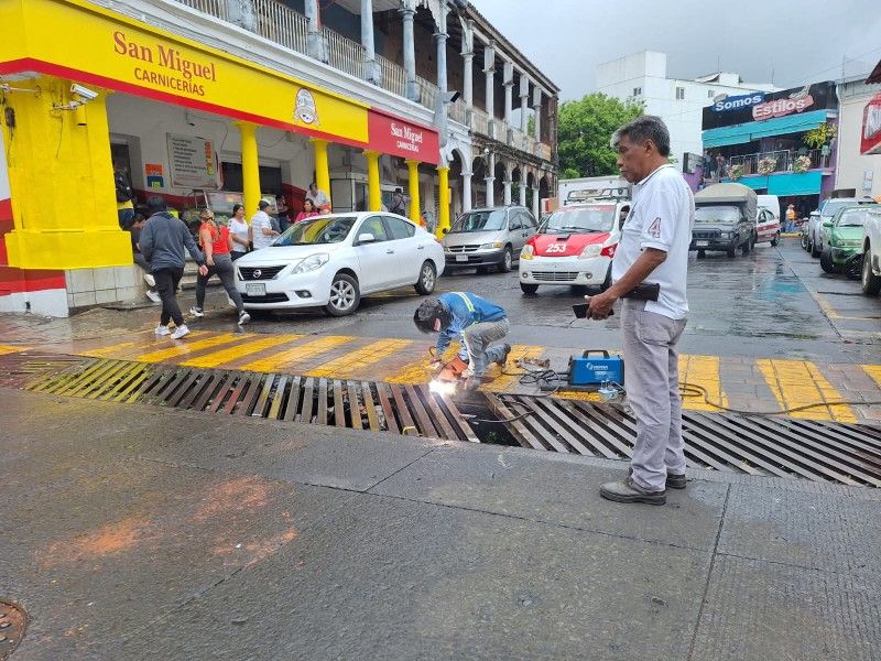 San Andrés Tuxtla, Ver. — Atendiendo las instrucciones de la alcaldesa Dra. María Elena Solana Calzada, la Dirección Municipal de Obras Públicas lleva a cabo labores de mantenimiento y mejoramiento de infraestructura urbana en la calle Venustiano Carranza, ubicada en la cabecera municipal, realizando trabajos de mejora en las parrillas del sistema de alcantarillado.