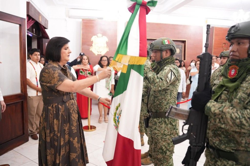 Posteriormente, la doctora María Elena Solana Calzada, realizó junto con la escolta del Primer Batallón de Infantería con sede en esta ciudad, el acto ceremonial de entrega del lábaro Patrio, para posteriormente salir al balcón central, donde vitoreó a los héroes de la Independencia.