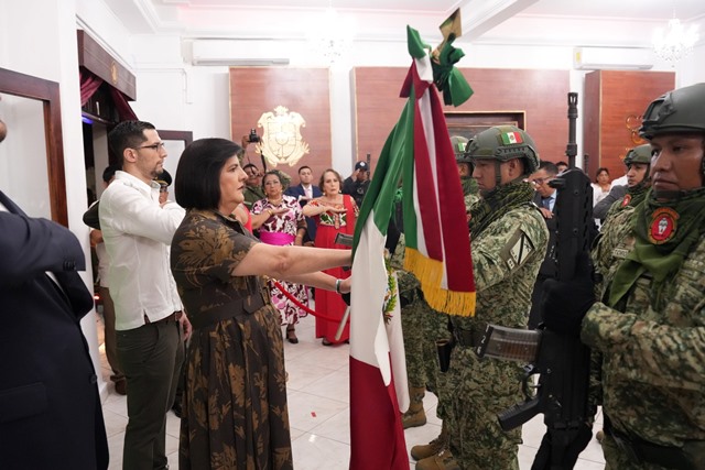 Posteriormente, la doctora María Elena Solana Calzada, realizó junto con la escolta del Primer Batallón de Infantería con sede en esta ciudad, el acto ceremonial de entrega del lábaro Patrio, para posteriormente salir al balcón central, donde vitoreó a los héroes de la Independencia.