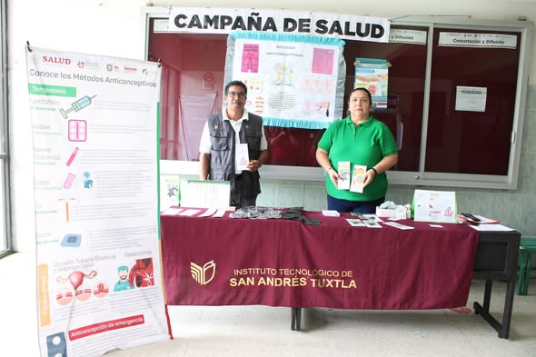 El día de hoy en las instalaciones del Instituto Tecnológico Superior de San Andrés Tuxtla, se llevó a cabo la Campaña de Salud: “+Métodos Anticonceptivos = A – Embarazos No Deseados”, actividad que estuvo organizada por el Servicio Médico del ITSSAT a cargo de la Pt. Enf. Gral. Elizabeth Balderas Lara y contó con el apoyo del Promotor en Salud Miguel Morales Molina de la Unidad Médica de Sihuapan, adscrito a la Jurisdicción Sanitaria No. 10 de San Andrés Tuxtla.