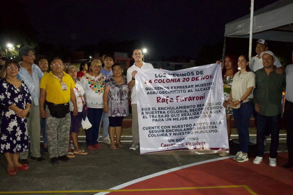 Durante el programa de «Enchulamiento» en la colonia 20 de noviembre, se llevó a cabo la iluminación del parque, la cancha deportiva, limpieza de calles y banquetas, pintura en guarniciones, poda de árboles y recepción de solicitudes para diversas áreas municipales.
